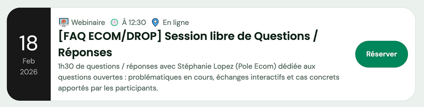 Cette semaine, place à une session 100% interactive avec Stéphanie Lopez (Pôle Ecom). Pendant 1h30, posez toutes vos questions sur vos problématiques en cours : acquisition, conversion, logistique, scaling, dropshipping…