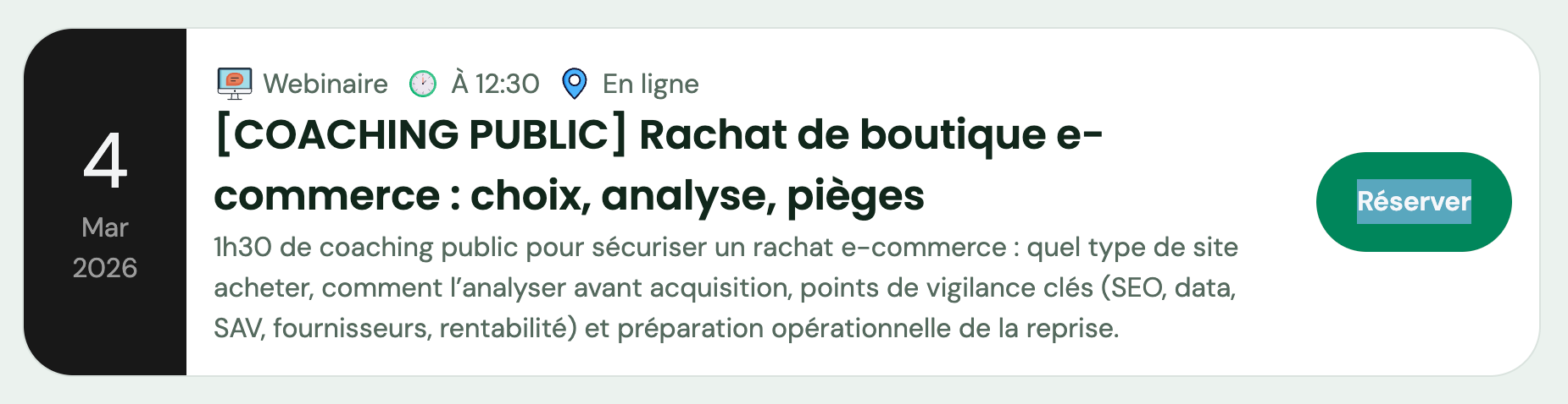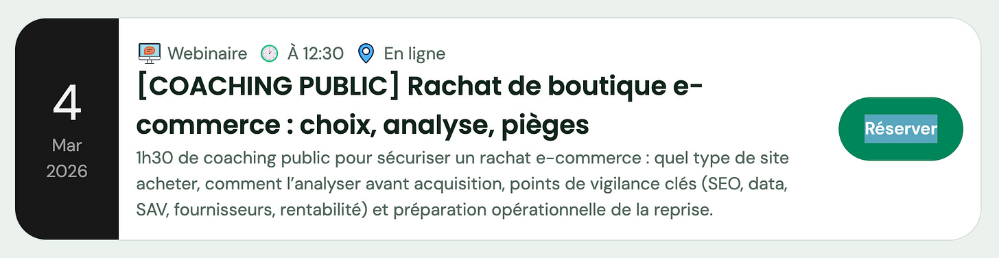 Le seul sujet où il n’y aura pas de “choix”, c’est dans le coaching de la semaine, qui s’annonce épique ! Car au delà du sujet (le rachat de boutique e-commerce), nous allons enfin dévoiler ce qui sera l’un des projets marquants de 2026 pour Dotmarket.